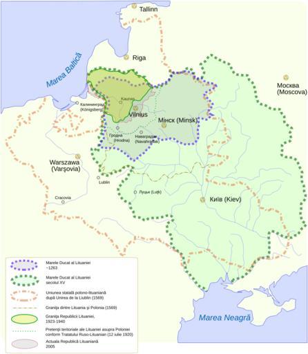 | Keywords: LithuanianHistory ro.svg Historical Lithuanian borders Historische Grenzen Litauens Granițele istorice ale Lituaniei LithuanianHistory svg 2010-12-22 11 19 UTC LithuanianHistory svg User Knutux derivative work Radu Gherasim <span class signature-talk >talk</span> Radu Gherasim LithuanianHistory svg Original upload log This image is a derivative work of the following images File LithuanianHistory svg licensed with PD-user 2005-12-23T14 53 49Z Urmas 1525x1750 112538 Bytes <nowiki></nowiki> 2005-12-19T06 32 01Z Knutux 1525x1750 112525 Bytes <nowiki>small corrections name Warsaw in parentheses Lithuania claims in legend were in wrong color </nowiki> 2005-12-19T06 28 06Z Knutux 1525x1750 112397 Bytes <nowiki>wrong page size</nowiki> 2005-12-19T06 23 56Z Knutux 744x1052 112314 Bytes <nowiki>Historical Lithuanian borders Historical maps of Lithuania</nowiki> Maps of Grand Duchy of Lithuania SVG maps showing history in Romanian |