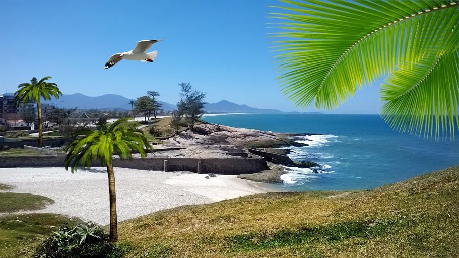 Keywords: litoral serra orla beach mar nature water beira mar ocean sky salt water blue sky tranquility rocks bird stones sand birds seagulls coconut trees island flower saquarema rio de janeiro brazil atlantic forest