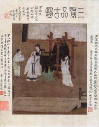 | Keywords: Liu Songnian Testing Bell.jpg en Three Sages Appreciating Antique by Liu Songnian Polychrome on silk Southern Song Dynasty abt 1300 CE Private collection 2011-06-22 15 31 26 Photograph by contributor Liu Songnian PD-art-100 Check categories 2013 October 29 Liu_Songnian |