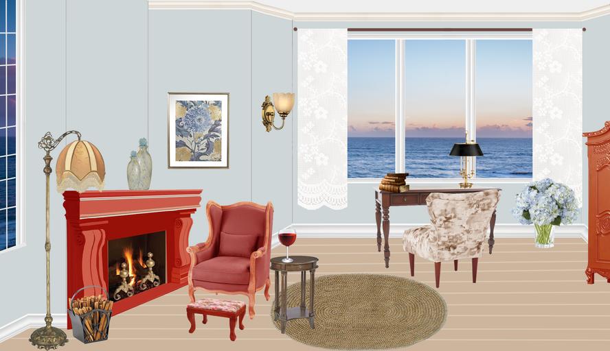 Keywords: living windows fireplace armchair hearth flower pot wood writing table wall light floor lamp vintage twilight sunset living room drapes