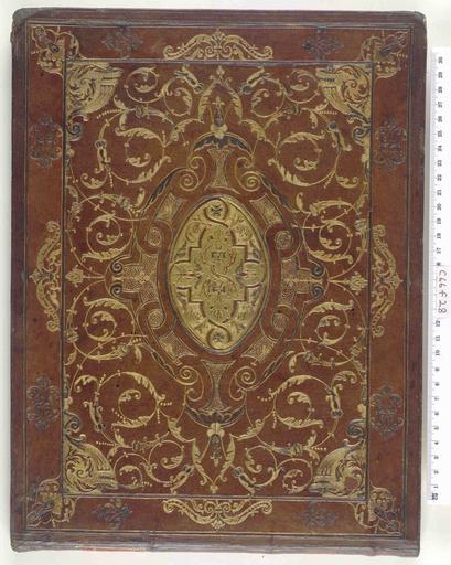 Keywords: Livre de la Conqueste de la Toison d-Or, - Upper cover (c66f28).jpg Style Centre and cornerpiece; Caption Upper cover; Colour Brown; Edge Unspecified exhibition history Decorative Technique Tooled in gold Tooled in silver; Cover Material Goatskin includes morocco turkey etc Macchi states; third quarter century England F A Bearman N H Krivatsy J F Mowery Fine and historic bookbindings p 58-59 3 3; H M Nixon M M Foot The history of decorated bookbindings fig 30; Österreichische Nationalbibliothek Wien Europäische Einbandkunst p 97 n 171 and for French Renaissance bindings there are unusual lancet shaped tools in the corners and 4 pairs of volutes object history Text 1563; Paris; Unspecified object type Cc-zero place of creation Binding France place of discovery Unspecified British Library image http //www bl uk/catalogues/bookbindings/LargeImage aspx RecordId 020-000006794 ImageId ImageId 43002 Copyright BL Livre de la Conqueste de la Toison d Or Uploaded with GWToolset Livre de la Conqueste de la Toison d Or - Upper cover c66f28 http //www webarchive org uk/bldatasets/bindings/7547_4 jpg Bookbinding 16th-century bookbinding British Library Bookbindings |