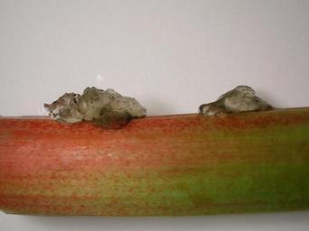 Keywords: Lixus concavus and sap on Rhubarb.JPG en Sap from gummosis caused by Lixus concavus on Rhubarb Rheum own Rosser1954 Roger Griffith 2010-07-21 Gummosis Lixus concavus Rhubarb