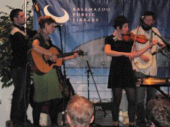 Keywords: kalamazoo library indie music folk live concert liveconcert Lloyd & the Fellas at Kalamazoo Public Library, Wednesday, December 16, 2009. Lloyd & the Fellas met at folk festivals, in sister circles and among gardens in Michigan, assembling live in February 09. The Fellas are a fun time: great for little ones, young hip things, middlers and elders alike. These folks are the ringleaders of a journey through varied sounds: jumpy banjo-y joyful songs; tunes for healing; aching songs that swell with unhurried intensity. The Fellas are Elisabeth Pixley Fink (Lloyd!): lead vocals, piano, charango, guitar, Samantha Cooper (Slam!): vocals, violin, mandolin, feet, Ira Cohen (Iree!): vocals, banjo, guitar, hand puppets, Matt Hollander: drummer boy, hand clapper, Joel Pixley-Fink: bass bumper. www.kpl.gov Lloyd & the Fellas at Kalamazoo Public Library, Wednesday, December 16, 2009. Lloyd & the Fellas met at folk festivals, in sister circles and among gardens in Michigan, assembling live in February 09. The Fellas are a fun time: great for little ones, young hip things, middlers and elders alike. These folks are the ringleaders of a journey through varied sounds: jumpy banjo-y joyful songs; tunes for healing; aching songs that swell with unhurried intensity. The Fellas are Elisabeth Pixley Fink (Lloyd!): lead vocals, piano, charango, guitar, Samantha Cooper (Slam!): vocals, violin, mandolin, feet, Ira Cohen (Iree!): vocals, banjo, guitar, hand puppets, Matt Hollander: drummer boy, hand clapper, Joel Pixley-Fink: bass bumper. www.kpl.gov
