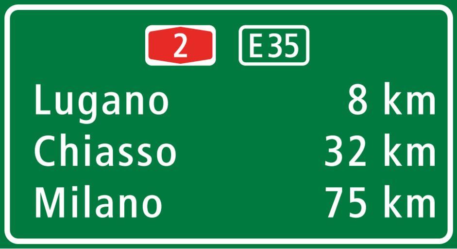Keywords: Loc.-Lugano.PNG en A route confirmation sign on the A2 Highway near Lugano Ticino Switzerland informing motorists of their distance in kilometres from the places listed it Esempio di un cartello autostradale svizzero sull'autostrada A2 nei pressi di Lugano Svizzera own Parinig 2011-07-17 Cc-zero PD-ineligible PD-shape E35 Switzerland |