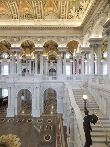Keywords: LoC-TJ-Great-Hall-from-2nd-floor-Highsmith.jpeg LargeImage Great Hall View from the second floor west corridor Library of Congress Thomas Jefferson Building Washington D C Once in the Great Hall you will be able to appreciate the grandeur of the architecture The ceiling 75 feet above the marble floor is decorated with stained glass skylights supported by elaborately paneled beams finished in aluminum leaf In the center of the marble floor is a large brass inlay shaped like a sun on which are inscribed the four cardinal points of the compass Bordering the sun on four sides are round medallions with 12 brass inlays representing the signs of the zodiac In niches on the west side of the hall are two bronze masks formerly used as drinking fountains On the east side is the Commemorative Arch leading back to the Main Reading Room pictured in the image on the right Inscribed into the frieze above are the words Library of Congress Above that flanked by eagles is a tablet with the names of the engineers and architects who were responsible for the design and construction of the Jefferson Building Image of the detail on one staircase in the Library of Congress' Great HallTwo grand staircases that display the work of sculptor Philip Martiny flank the Great Hall one of these staircases is shown in the image to the left Upon the newel post at the base of the railing of each staircase stands an unnamed larger-than-life-size bronze female figure holding aloft a torch Be sure to look closely at the marble figures carved into the outside of the railings These putti or small children complete with the tools of their trade represent the various occupations habits and pursuits of modern life a musician with lyre and music book; an electrician holding a telephone; and an entomologist with specimen box and butterfly net; among others Note especially the two figures flanking globes halfway up the staircase on each side On the south side of the hall are represented Africa and America with those continents shown on the globe between them; on the north side are Europe and Asia Much of the preceding text is derived from the http //www loc gov/jefftour/firstfloor html Library of Congress's virtual tour of the first floor of the Thomas Jefferson Building Library of Congress Prints Photographs Division LC-DIG-highsm-01968 original digital file http //memory loc gov/master/pnp/highsm/01900/01968u tif uncompressed archival TIFF version 175 MiB converted to JPEG quality level 88 with the GIMP 2 6 7 1896 Building and artwork designed and built 1896 by various architects and artists Photographed 2007 by Carol Highsmith 1946 “ who explicitly http //www loc gov/rr/print/res/482_high html placed the photograph in the public domain No known restriction on publication LOC-image highsm 01968 PD-old PD-Highsmith Interior of Thomas Jefferson Building Arch portals Halls Photographs by Carol M Highsmith Philip Martiny
