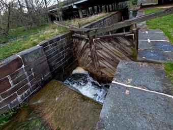 Keywords: Lock 13 C and O Canal.jpg en Lock 13 on the C O Canal Part of this lock is underneath the American Legion Bridge Interstate 495 Note also that the upstream gate is BELOW the breast wall or cill This is the later post 1830 design of the lock Most locks below Point of Rocks have the pre-1830 design which has the upstream gate ABOVE the breast wall and has culverts in the lock masonry to fill the lock The gates in the locks today are reconstructions with paddle valves in the gates rather than using the culverts most of which have been closed with bricks but Lock 13 is an anomaly having the post-1830 design See Thomas Hahn's Towpath Guide for more info on this own Bonnachoven Chesapeake Ohio Canal National Historical Park Locks water transport Cc-zero |