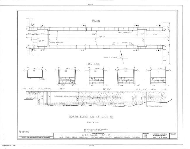 Keywords: Lock 35 Chesapeake and Ohio Canal drawing from HABS.png en Drawing of Lock 35 an 1830 design lock Note how gates are BELOW the breast wall and there are no conduits in the masonry as opposed to the 1828 design locks HABS says HABS MD 22-HARF V 9- sheet 1 of 2 - Chesapeake Ohio Canal Lock 35 62 3 miles above tidewater Sharpsburg Washington County MD http //www loc gov/pictures/collection/hh/item/md0632 sheet 00001a/ LOC-image hhh md0632 Historic American Buildings Survey MD-773 39 4575 -77 74917000000001 Chesapeake Ohio Canal National Historical Park Locks water transport |