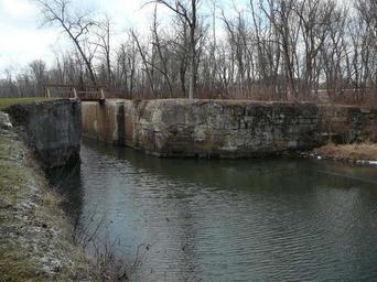 Keywords: Lock 69 C and O Canal from NPS.jpg en Lock 69 NPS site says Lock 69 is the 11th of the 13 composite locks These locks differ from the other locks on the canal Between the upper end of the lower gate pockets to the lower end of the upper gate pockets the stone walls were moved 9 ¼° on each side resulting in a clear dimension between lock walls of 16 ™-16 ½ rather that the 15 ™ previously adhered to The normal clear dimension was resumed both up and down from these points The walls were of rough-cut and rough-coursed limestone principally dry-laid where the walls were widened and mortared in the other areas The wider area was filled in with 5 ¼ square timbers This wooden section of the lock was water-proofed at first by being kyanized and later with creosote Lock 69 is located a quarter of a mile below Lock 70 and two-thirds of a mile above Lock 68 The area is a fourth of a mile from the village of Oldtown and early Maryland settlement Start of work on the lock began in 1848 and it was finished in 1850 The wood lining of the lock was totally replaced with concrete after 1900 including the coping and much of the upper and lower extension and wingwalls Protruding existing bolts on the towpath side indicate an added heavy wood timber to the top of the wall probably as a tow line but no wood remains The lower concrete-covered lock gate pockets are 22 deep rather than the normal 16 one of the few instances in variance of this dimension The upper lock gates remain the towpath gate is in place and the berm is fallen in Much of the gate hardware is in place although not of the original type The wall are not nearly as plumb in the original 15' clear width is slight The lock has been dammed with concrete at the upper ened of the upper extension wall National Park Service http //www hscl cr nps gov/insidenps/report asp STATE PARK CHOH STRUCTURE SORT RECORDNO 1034 National Park Service Dept of Interior US Government Chesapeake Ohio Canal National Historical Park Locks water transport PD-USGov |