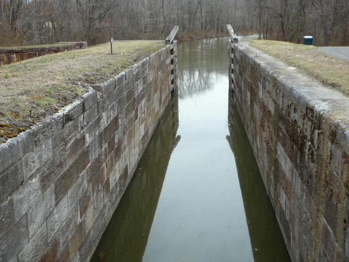 Keywords: Lock 75 C and O Canal From NPS.jpg en Lock 75 last lift lock on C and O Canal NPS site says; This is a standard cut stone lift lock of gray limestone with a bypass flume on the berm side The lock was built to 1836 specifications and is typical to that standard It is 700' above Lock 74 and is the last of the numbered lift locks on the canal There are equally space bolts protruding above the coping that indicate that a continuous 6 wood coping had been added to deepen the canal but no timber remains The 4' long upper extension wall is grooved vertically midway up to receive drop planks This lock was fitted with a drop gate atop the breast walls to replace the upper gates but nothing remains of the gate or its operating mechanism The upper wingwalls flare out about 60 degrees above the upper extension wall and run for about 13' The towpath buts into the upper towpath canal wall and the berm then returns on itself to run for 6 ™ parallel to the lock This wall becomes the lock side of the bypass flume entrance The lower extension walls run for 13' and flares out at about a 60 degree angle The lower towpath wingwall runs for about 14½' to butt into the 100' long dry laid stone wall of the lower canal and towpath rise The berm wing runs for 143' turns again to run perpendicular to the lock for 8'4 before butting into the 6' deep 8' wide notch for the by-pass flume exit After the exit the wall returns to full height to run another 8½' into the lower canal berm bank This last portion of wall is buttressed by a 3' thick stepped wall which extends down canal for 50' A pair of good condition creosoted lock gates remain in a closed position in the lower lock gate pocket The gates have lost their balance arms The walls ™ minimum clear width is 14'-5 just below the upper gate pockets National Park Service http //www hscl cr nps gov/insidenps/report asp STATE PARK CHOH STRUCTURE SORT RECORDNO 1097 National Park Service Dept of Interior US Government Chesapeake Ohio Canal National Historical Park Locks water transport PD-USGov |