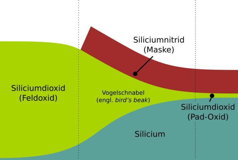 MAKE A MEME View Large Image LOCOS birds beak DE.svg en Detail cross section at the edge of an isolation windows after a simple LOCOS process The schematic shows partial growth of Silicon dioxide into the silicon substrate and distortion of the silicon nitrite mask ...