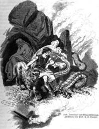 | Keywords: Loke, Fenriswolf und Midgardschlange.jpg Loke Fenriswolf und Midgardschlange Loki takes fatherly care of Fenrir and Jörmungandr The female figure in the cave is presumably Hel though perhaps Angrboða is not out of the question Wägner Wilhelm 1882 Nordisch-germanische Götter und Helden Otto Spamer Leipzig Berlin Page 253 Published in 1882 Carl Emil Doepler 1824-1905 PD-old Loki Fenrir Jörmungandr Hel being Wägner's Nordisch-germanische Götter und Helden Midgardschlange Carl Emil Doepler | ||||