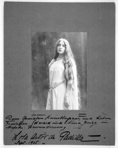 Keywords: edvard grieg edvardgrieg vintage black and white blackandwhite historic norway lola artôt de padilla lolaartôtdepadilla woman portrait autograph 1905 standing opera soprano costume opera across the commons operaacrossthecommons monochrome people blackandwhite photo border outdoor black and white Artist: Herm. Hamnqvist Date/place: Sept. 1905, Stockholm Subject: Lola Artôt de Padilla Medium: photographic positive, B&W Notes: French-Spanish soprano. Written under the photo. "Dem Genialen Kunstlerpaar, und lieben Freunden, Edvard und Nina Grieg, in tiefsten Bewunderung. Lola Artôt de Padilla - Sept 1905" (The genius couple of artists and dear friends, Edavard and Nina Grieg in deepest admiration. Lola Artôt de Padilla - Sept. 1905) Persistent URL: Original belongs to the Edvard Grieg Archives at Bergen Public Library Original reference: EGM0287 Artist: Herm. Hamnqvist Date/place: Sept. 1905, Stockholm Subject: Lola Artôt de Padilla Medium: photographic positive, B&W Notes: French-Spanish soprano. Written under the photo. "Dem Genialen Kunstlerpaar, und lieben Freunden, Edvard und Nina Grieg, in tiefsten Bewunderung. Lola Artôt de Padilla - Sept 1905" (The genius couple of artists and dear friends, Edavard and Nina Grieg in deepest admiration. Lola Artôt de Padilla - Sept. 1905) Persistent URL: Original belongs to the Edvard Grieg Archives at Bergen Public Library Original reference: EGM0287 |