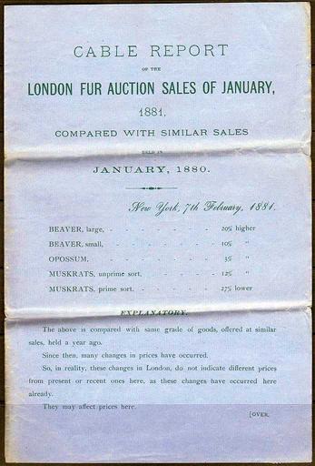 | Keywords: London Fur Auction Sales of January 1881.jpg In an envelope of 1881 U S 1880's FURS SKINS HIDES MERCHANTS NEW YORK CIRCULAR WITH A REPORT OF THE LONDON FUR AUCTION SALES INSIDE WEEKLY REPORT FOR CONSIGNORS INTEREST From Ramsay McNaughtan Son and accessor of late WM MacNaughtan Fur Commission Merchant established 1959 Furs skins hides wool c No 3 Howard Street New York Cable report of the London Fur auction sales of January 1881 Ebay jeneezirish35 1881-01 Ramsay McNaughtan PD-old <gallery> File Ramsay MacNaughtan New York Fur Commission Merchant 1881 jpg File London Fur Auction Sales of January 1881 jpg File Baling Glovers' Stock 1881 jpg File MacNaughtan's New York Furs Skins Weekly Reports for Consignors 1881 jpg </gallery> Fur wholesale dealers in New York MacNaughtan Ramsey Fur auctioneers Fur trading values Fur fashion in 1881 |