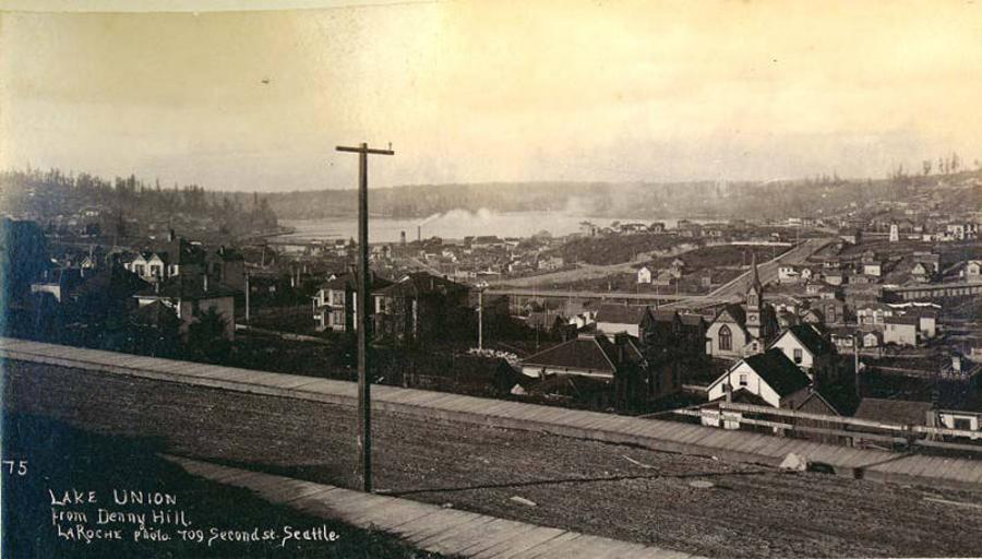 | Keywords: Looking north from near 5th Ave and Stewart St toward Lake Union, Seattle, Washington, ca 1891 (LAROCHE 343).jpeg Photograph Creator Frank La Roche From album entitled Prospectus of the Lake Union Improvement Company under the management of Mr L H Griffith p 21 PH Coll 33 21 Subjects LCTGM Churches--Washington State --Seattle Subjects LCSH Lake Union Improvement Company Seattle Wash ; Seattle Wash --Growth--History; Union Lake Wash ; Norwegian-Danish Baptist Church Seattle Wash View of South Lake Union from Denny Hill which was later regraded away depicted place Seattle Washington circa 1891 Institution University of Washington UWASH-LAROCHE-source accession number laroche 343 PD-old-auto-1923 1936 Information field Order Number LUC08 ImageNote 1 332 203 32 24 800 455 2 Westlake Avenue ImageNoteEnd 1 Denny Regrade Seattle Washington South Lake Union Seattle Washington Lake Union Seattle Washington in the 1890s Norwegian Danish Baptist Church Seattle Prospectus of the Lake Union Improvement Company Black and white photographs |