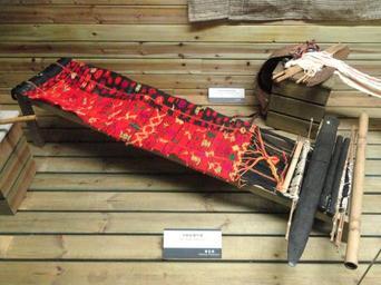 Keywords: Loom - Yunnan Nationalities Museum - DSC04120.JPG Jingpo waist loom Exhibit in the weaving collection in the Yunnan Nationalities Museum Kunming Yunnan China I took this photograph 2011-08-13 01 46 29 Daderot Public domain Weaving in the Yunnan Nationalities Museum Jingpo tools and utensils Backstrap looms |