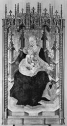 Keywords: Lorenzo de Zaragoza - Madonna and Child on a Throne - Walters 37747.jpg Mary is here both virgin and mother She is Queen of Heaven holding her son but her long unbound hair is uncovered- appropriate to a young maiden The lilies further symbolize her virginal purity while the roses signify her motherly compassion Christ's dual nature is also revealed His robe is trimmed with ermine worn only by kings but he plays with his mother's winding spool According to popular pious meditations when the Holy Family reached Egypt Mary sewed and spun cloth to keep them from starving; like a good boy Jesus helped her Once the center panel of a large altarpiece this is one of the great Spanish works of the period The style is close to that of Gonzalo Pérez the major artist of the International Gothic in Valencia Influenced by Italian painting that of Valencia is more linear and flamboyant than Netherlandish art of the time between 1410 1420 Late Medieval tempera gold leaf on wood cm 222 9 116 2 16 5 accession number 37 747 28898 Louis Quer Barcelona Henry Walters city Baltimore Walters Art Museum Henry Walters Acquired by Henry Walters 1915 The International Style The Arts in Europe Around 1400 The Walters Art Gallery Baltimore 1962 place of origin Valencia Spain Walters Art Museum license 3D Medieval art in the Walters Art Museum Gonçal Peris Paintings in the Walters Art Museum Madonna and Child Flight into Egypt |