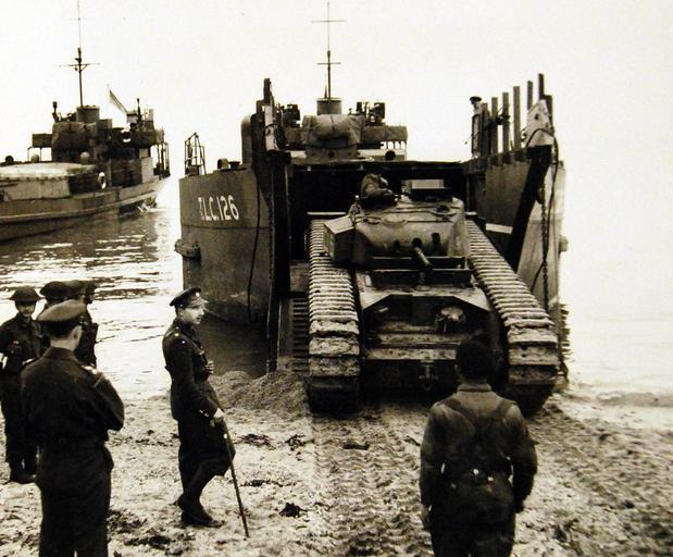 | Keywords: vehicle outdoor monochrome Lot 11634-5: HMS LCI(L)-126, a “Churchill” “Tank Landing Craft” being landed from a craft during combined operations. The “Churchill” is so strongly armoured that it an be used as a pill-box, but possess remarkable speed and maneuverability. Six pounder guns give it formidable fire-power, circa 1942. Office of War Information Photograph. (2016/01/22). Lot 11634-5: HMS LCI(L)-126, a “Churchill” “Tank Landing Craft” being landed from a craft during combined operations. The “Churchill” is so strongly armoured that it an be used as a pill-box, but possess remarkable speed and maneuverability. Six pounder guns give it formidable fire-power, circa 1942. Office of War Information Photograph. (2016/01/22). |