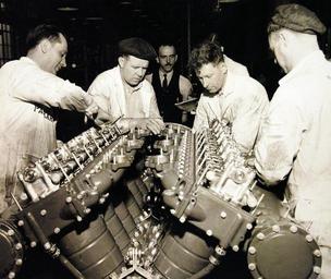 MAKE A MEME View Large Image Packard Motor Car Company, Detroit, Michigan, May 1941. Machinists assembling the supercharger to a marine engine. One of 1200 horse power engines which drive the Navy’s deadly “Mosquito” boats. Photographed by Alfred T. Palmer, ...