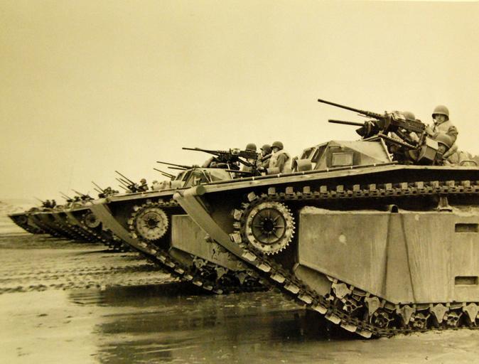 Keywords: vehicle outdoor monochrome Lot 2290-1: Landing Vehicle Tracked (LVT), amphibious warfare vehicle. Shown are a row of the “Water Buffalos,” designed, engineered and built by Food Machinery Corporation Division at Lakeland, Florida; Los Angeles, San Jose, and Riverside, California. Photograph donated by Food Machinery in June 1945. (8/28/2015). Lot 2290-1: Landing Vehicle Tracked (LVT), amphibious warfare vehicle. Shown are a row of the “Water Buffalos,” designed, engineered and built by Food Machinery Corporation Division at Lakeland, Florida; Los Angeles, San Jose, and Riverside, California. Photograph donated by Food Machinery in June 1945. (8/28/2015). |