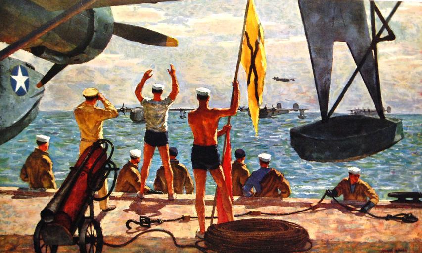 Keywords: Lot 3124-5: Paintings of Naval Aviation during World War II: Abbott Collection. #50: “Making the Buoy”. Artwork by Joseph Hirsch. “Back from hours in the air on patrol, a flight of four-engine patrol bombers settle to water and maneuver up to the beaching buoys preparatory to beaching. To weary, hungry pilots and crew, the signals of the beaching crew are a welcome sight. After making their planes fast to the buoys, handling wheels and lines will be attached to the plane’s hull and it will be towed up to the ramp. The beaching crew, clad in swimming trunks, wait until time to wade down the ramp to attach beaching gear.” (7/10/2015). Lot 3124-5: Paintings of Naval Aviation during World War II: Abbott Collection. #50: “Making the Buoy”. Artwork by Joseph Hirsch. “Back from hours in the air on patrol, a flight of four-engine patrol bombers settle to water and maneuver up to the beaching buoys preparatory to beaching. To weary, hungry pilots and crew, the signals of the beaching crew are a welcome sight. After making their planes fast to the buoys, handling wheels and lines will be attached to the plane’s hull and it will be towed up to the ramp. The beaching crew, clad in swimming trunks, wait until time to wade down the ramp to attach beaching gear.” (7/10/2015). |