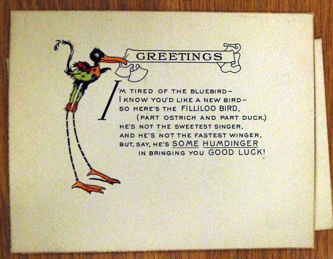 Keywords: text writing document photo border Lot-7607-6: WWI Greeting Cards. Card reads, “Greetings. I’m tired of the bluebird – I know you’d like a new bird – so here’s the Filliloo Bird (part ostrich and part duck) – He’s not the sweetest singer – and he’s not the fastest winger – But, say, he’s some humdinger – in bringing you good luck!” Courtesy of the Library of Congress. (2016/09/02). Lot-7607-6: WWI Greeting Cards. Card reads, “Greetings. I’m tired of the bluebird – I know you’d like a new bird – so here’s the Filliloo Bird (part ostrich and part duck) – He’s not the sweetest singer – and he’s not the fastest winger – But, say, he’s some humdinger – in bringing you good luck!” Courtesy of the Library of Congress. (2016/09/02). |