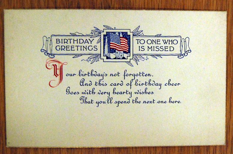 Keywords: text writing document sign whiteboard Lot-7607-7: WWI Greeting Cards. Card reads, “”Birthday Greetings To One Who Is Missed. Your birthday’s not forgotten / And this card of birthday cheer / Goes with very hearty wishes / That you’ll spend the next one here.” Courtesy of the Library of Congress. (2016/09/02). Lot-7607-7: WWI Greeting Cards. Card reads, “”Birthday Greetings To One Who Is Missed. Your birthday’s not forgotten / And this card of birthday cheer / Goes with very hearty wishes / That you’ll spend the next one here.” Courtesy of the Library of Congress. (2016/09/02). |