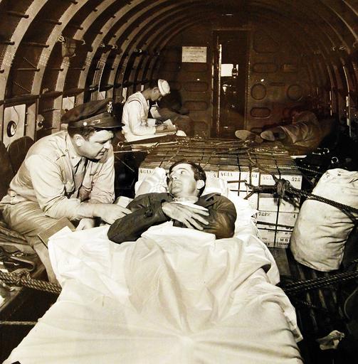 | Keywords: Lot-926-7: The Navy’s Own Airline. Any mention of aircraft in war time invariably connotes the deadly use of planes as offensive and defensive weapons – bombers, fighters, and the varying adaptations of these two general classes. Yet, even in war, the plane is filling the function which was its biggest role in peacetime – and will be even more important when peace comes again. That is, the task of delivering passenger and freight. Flying under the aegis of the Naval Air Transportation Service (NATS), giant R4D planes (the equivalent of DC-5’s) transport men and material of war all over the world to the fronts where they are needed the most. Founded five days after the Pearl Harbor attack, NATS today links five continents, spans many seas in its unending traffic runs. Its ever-growing staff of pilots and groundsmen now includes 2,500 men. Run in business-like fashion, according to minutely-timed schedules, NATS operates 60,000 miles of flight, stopping at every type of field from jungle “whistle-stops” to metropolitan airports. Shown: Mercy and Merchandise. Both are combined on this flight of an NATS plane north from Brazil. Stricken with a tropical disease, a U.S. Government employee is flown home under the care of a U.S. Army doctor. Behind him is a cargo of Brazilian quartz, vital in the manufacture of military radios. Official Navy Photograph, released October 5, 1943. Courtesy of the Library of Congress. (2016/04/14). Note, photographed through Mylar sleeve. Lot-926-7: The Navy’s Own Airline. Any mention of aircraft in war time invariably connotes the deadly use of planes as offensive and defensive weapons – bombers, fighters, and the varying adaptations of these two general classes. Yet, even in war, the plane is filling the function which was its biggest role in peacetime – and will be even more important when peace comes again. That is, the task of delivering passenger and freight. Flying under the aegis of the Naval Air Transportation Service (NATS), giant R4D planes (the equivalent of DC-5’s) transport men and material of war all over the world to the fronts where they are needed the most. Founded five days after the Pearl Harbor attack, NATS today links five continents, spans many seas in its unending traffic runs. Its ever-growing staff of pilots and groundsmen now includes 2,500 men. Run in business-like fashion, according to minutely-timed schedules, NATS operates 60,000 miles of flight, stopping at every type of field from jungle “whistle-stops” to metropolitan airports. Shown: Mercy and Merchandise. Both are combined on this flight of an NATS plane north from Brazil. Stricken with a tropical disease, a U.S. Government employee is flown home under the care of a U.S. Army doctor. Behind him is a cargo of Brazilian quartz, vital in the manufacture of military radios. Official Navy Photograph, released October 5, 1943. Courtesy of the Library of Congress. (2016/04/14). Note, photographed through Mylar sleeve. |