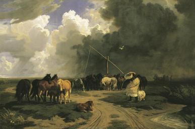 Keywords: Lotz, Károly - Horses in a Rainstorm - Google Art Project.jpg Oil Canvas 126 5 x 191 cm special url_id 9AEd2XWXXgSOzA PD-old-100-1923 1904 Google Art Project works by Károly Lotz Paintings by Károly Lotz in the Hungarian National Gallery