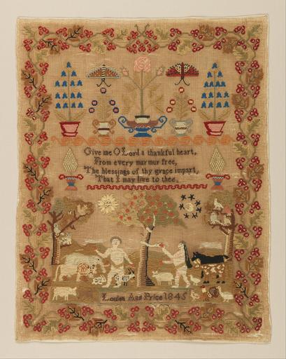 Keywords: Louisa Ann Price - Sampler - Google Art Project.jpg Louisa 5492599 Ann Price /collection/cooper-hewitt-national-design-museum/artwork/sampler-louisa-ann-price/5492600/ 75287 Louisa Ann Price /artist/louisa-ann-price/6833143/ 6833143 /collection/cooper-hewitt-national-design-museum/ Cooper-Hewitt National Design Museum 3644669 http //www cooperhewitt org/ /collection/cooper-hewitt-national-design-museum/artwork/sampler-louisa-ann-price/5492600/ 1845 1845 Medium wool embroidery on linen foundationTechnique embroidered in cross stitch on plain weave foundation By 1941 Mrs Henry E Coe Eva Johnston Coe 1941 Museum for the Arts of Decoration of the Cooper Union 5492600 False 1845 1941-69-22 http //collection cooperhewitt org/view/objects/asitem/id/75287 Bequest of Mrs Henry E Coe Sampler 1840 1850 1845 False 0 798828125 Object sampler-louisa-ann-price Sampler s H x W 54 x 43 cm 21 1/4 x 16 15/16 in Louisa Ann Price 1845 Medium wool embroidery on linen foundationTechnique embroidered in cross stitch on plain weave foundation By 1941 Mrs Henry E Coe Eva Johnston Coe 1941 Museum for the Arts of Decoration of the Cooper Union special url_id -wEV3TF3hFH2tg PD-old-70-1923 Google Art Project works by Louisa Ann Price Textiles in the Cooper “Hewitt Smithsonian Design Museum 1840s samplers Google Art Project works in Cooper-Hewitt Smithsonian Design Museum 1845 works |