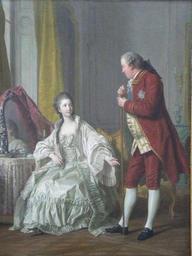 Keywords: Louvre-peinture-francaise-p1020331.jpg Artwork Creator Louis-Michel van Loo Le Marquis de Marigny et sa femme Alternate titles Frère cadet de la marquise de Pompadour Marigny 1721-1781 fut le directeur des Bâtiments de Louis XV de 1751 à 1773 Il est représenté avec sa jeune épouse de dix-huit ans née Marie-Françoise Constance Julie Filleul 1751 - 1822 deux années après leur mariage 1769 Oil on canvas Size m 0 975 1 296 Institution Louvre room ID 368 object department paintings 00000104461 louvre online 11556 Christie's online 3072179 5192 14 object history by 1781 Abel-François Poisson de Vandières marquis de Marigny et de Ménars 1727-1781 inheritance marquise de Marigny inheritance Adélaïde Filleul acquisition comte August-Charles-Joseph de Flahaut acquisition Lady Emily Fitzmaurice acquisition A E H Digby ProvenanceEvent 1951-06-20 sale Digby Paris by 1951 Agnew ™s ProvenanceEvent 1994-06-10 auctioned Christie's London price GBP 331500 credit line ProvenanceEvent 1994 gift Louvre Paris Société des Amis du Louvre accession number RF 1994-17 00000104461 Rama <gallery> Van Loo - Le Marquis de Marigny et de sa femme 1769 jpg high resolution Van Loo - Marigny cadre JPG with frame </gallery> PD-old-100 ImageNote 1 231 94 82 99 386 514 2 Abel-François Poisson de Vandières marquis de Marigny 1727-1781 ImageNoteEnd 1 ImageNote 2 96 172 75 93 386 514 2 Julie Filleul 1751-1822 ImageNoteEnd 2 DEFAULTSORT 1769; Poisson de Vandière Paintings by Louis-Michel van Loo French paintings in the Louvre - Room 46 Abel-François Poisson de Vandières 1760s oil on canvas paintings in France 1760s paintings in the Louvre 1760s portrait paintings from France 1769 paintings in France 18th-century family portraits 18th-century people of France 18th-century oil portraits of sitting women at full length 18th-century oil portraits of standing men at full length 18th-century portrait paintings in interiors 18th-century portrait paintings in the Louvre 18th-century profile portraits of men Canes in portrait paintings Cosmetics in art Deshabille in art Dressing tables Eye contact in art Females with white dresses in art Marchionesses of France Gift of the Société des Amis du Louvre Habit à la française in portrait paintings Leaning people in art Male shoes in portrait paintings Paintings of people from France Marigny Panniers clothing in portrait paintings Portrait paintings of wedded couples Portraits with mirror Powdered hair in art Powdered wigs in art Rococo interiors Sash of the Order of the Holy Spirit in portrait paintings Star of the Order of the Holy Spirit in portrait paintings 1760s dresses