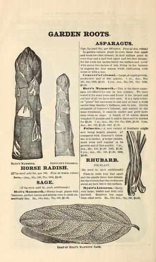 Keywords: Lovett's illustrated catalogue of fruit and ornamental trees and plants for the autumn of 1891 (16794958327).jpg GARDEN ROOTS <br> Barr's Mammoth Conover's Colossal <br> HORSE RADISH <br> If by mail add 15c ver 100 Free at dozen rates <br> Sets Doz 25c; 100 7bc; 1000 4 00 <br> SAGE <br> If by mail add 3c each additional <br> Holt s mammotli Forms large plants with <br> fmmense perfect leaves and seldom runs to seed; ex- <br> ceedingly fine Ea 10c; doz 75c; 100 5 00 <br> ASPARAGUS <br> iyr ' hy mail 25c per 100 extra Free at doz rates <br> In garden culture plant in rows three feet apart <br> and roots two feet distant; in field culture plant 1h <br> rows four and a half feet apart and two feet distant <br> Set the roots ten Inches below the surface and cover <br> with about two Inches of soil filling in the balance <br> by degrees the first season while cultivating with <br> horse or with a hoe <br> Conover's Colossal Large of rapldgrowth <br> productive and of fine quality 1 yr doz 20c; <br> 100 50c; 1000 3 50 2 yrs doz 30c; 100 75c 1000 <br> 5 00 <br> Barr's Mammoth This is the finest aspar- <br> agus yet offered for eale in this country We have <br> tested it for some years and found it the largest and <br> earliest of all we have ever seen It is a light-color- <br> ed grass but enormous in size and at least a week <br> earlier than Smalley's Defiance side by side Grown <br> alongside of Conover's Colossal and subject to the <br> same treatment it came in earlier and grew more <br> than twice as large A bunch of 25 edible shoots <br> weighed 13 pounds and is said to have sold in market <br> for 5 00 1 yr doz 30c; 100 75c; 1000 5 00 2 yrs <br> doz 40c; 100 1 00; 1000 7 50 <br> Palmetto A new variety of Southern origin <br> now being largely planted AS <br> compared with Conover's Colos- <br> sal it is earlier a better yielder <br> more even and regular m its <br> growth and of fine quality 1 yr <br> doz 40c; 100 1 00; 1000 7 50 <br> 2 yrs doz 50c; 100 1 25; 1000 <br> 9 00 <br> RHUBARB <br> PIE PLANT <br> By mail 5c 6ac i additixmaV <br> Plant in rows four feet apart <br> and the plants three feet distant <br> Set the roots so that the crowns are <br> about an inch below the surface <br> Myatt's liinnseus Early <br> very large tender and delicately <br> fiavored Requires less sugar <br> than other sorts Ea 10c; doz 75c; 100 3 00 <br> Leaf OF holt's Mammoth Sage 42764498 136632 68527 Page 46 Text http //www biodiversitylibrary org/page/42764498 1891 10 5962/bhl title 68527 Henry G Gilbert Nursery and Seed Trade Catalog Collection ; J T Lovett Company ; J T Lovett Company NameFound Asparagus NameConfirmed Asparagus var pygmaeus Makino EOLID 10487111 Biodiversity Heritage Library Lovett's illustrated catalogue of fruit and ornamental trees and plants for the autumn of 1891 Catalogs Commercial catalogs J T Lovett Company Little Silver New Jersey Plants Ornamental Seeds Shrubs Vegetables U S Department of Agriculture National Agricultural Library bhl page 42764498 dc identifier http //biodiversitylibrary org/page/42764498 bhlGardenStories Asparagus j t lovett company little silver new jersey plants ornamental u s department of agriculture national agricultural library bhlgardenstories Information field Flickr posted date ISOdate 2015-04-01 CC-BY-2 0 BioDivLibrary https //flickr com/photos/61021753 N02/16794958327 2015-08-23 20 54 48 cc-by-2 0 PD-old-70-1923 Asparagus Lovett's illustrated catalogue of fruit and ornamental trees and plants for the autumn of 1891 Photos uploaded from Flickr by FĂŚ using a script |