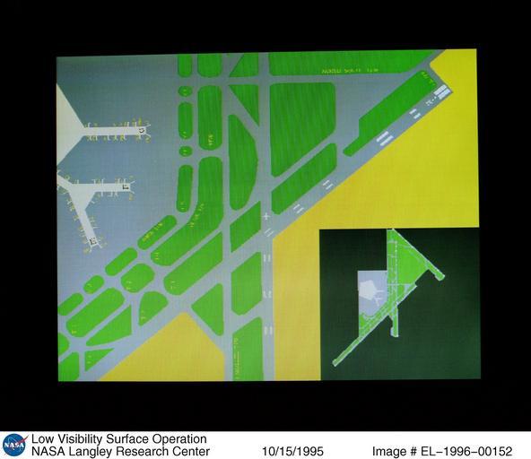 Keywords: Low Visibility Surface Operation DVIDS681770.jpg en Much research has been conducted to improve traffic flow in the terminal area; however little research has been done to improve traffic flow in the surface movement area or to prevent runway incursions especially during low-visibility conditions In response to this research need NASA Langley Research Center has been developing an electronic map for the cockpit based upon GPS positional information and having the capability to display other traffic and ATC-cleared routes to and from the gates This photograph shows an electronic map of a segment of Chicago O'Hare airport in the early stages of development Pilots can select zoom levels to provide more detail in the main display while displaying the whole airport in the lower right foe orientation A later map added an ownship symbol to indicate present position NASA Identifier L92-11219 2009-09-24 Glenn Research Center https //www dvidshub net/image/681770 681770 2012-10-10 10 23 WASHINGTON DC US PD-USGov Langley Research Center Images from DoD uploaded by Fæ