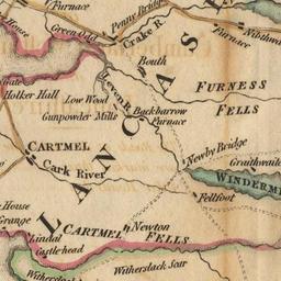 Keywords: Low Wood Gunpowder Mills map.jpg en Detail of A Map of the Lakes in Cumberland Westmorland and Lancashire scale about 3 5 miles to 1 inch in Guide to the Lakes 3rd edition 1821 by Thomas West http //www geog port ac uk/webmap/thelakes/html/lgaz/ws02sd38 htm Engravers Cornelius Pass and N Wolletern 1821 PD-old-100 1821 maps Cornelius Pass Furness Explosives manufacturers