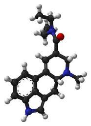 Keywords: LSD-from-xtal-and-Spartan-PM3-3D-balls-web.png Ball-and-stick model of the lysergic acid diethylamide LSD molecule C<sub>20</sub>H<sub>25</sub>N<sub>3</sub>O Colour code Carbon C grey-black Hydrogen H white Nitrogen N blue Oxygen O red Structure based on that found in the related salt LSD o-iodobenzoate monohydrate determined by X-ray crystallography in http //molpharm aspetjournals org/content/9/1/23 abstract Molecular Pharmacology 1973 9 23-32 Model manipulated in http //www crystalmaker com/ CrystalMaker 8 3 The structure of the LSD+H<sup>+</sup> cation from the above crystal structure was opened in http //www wavefun com/products/macintosh/Student/mac_student html Spartan Student 4 1 one hydrogen atom on the R<sub>3</sub>NH<sup>+</sup> group was deleted yielding the neutral LSD molecule Its structure was then refined with the PM3 semi-empirical method Image generated in http //accelrys com/products/discovery-studio/visualization/discovery-studio-visualizer html Accelrys DS Visualizer Own 2011-03-13 Ben Mills Benjah-bmm27 Images by Ben Mills Lysergic acid diethylamide |