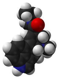 Keywords: LSD-from-xtal-and-Spartan-PM3-3D-sf-web.png Space-filling model of the lysergic acid diethylamide LSD molecule C<sub>20</sub>H<sub>25</sub>N<sub>3</sub>O Colour code Carbon C grey-black Hydrogen H white Nitrogen N blue Oxygen O red Structure based on that found in the related salt LSD o-iodobenzoate monohydrate determined by X-ray crystallography in http //molpharm aspetjournals org/content/9/1/23 abstract Molecular Pharmacology 1973 9 23-32 Model manipulated in http //www crystalmaker com/ CrystalMaker 8 3 The structure of the LSD+H<sup>+</sup> cation from the above crystal structure was opened in http //www wavefun com/products/macintosh/Student/mac_student html Spartan Student 4 1 one hydrogen atom on the R<sub>3</sub>NH<sup>+</sup> group was deleted yielding the neutral LSD molecule Its structure was then refined with the PM3 semi-empirical method Image generated in http //accelrys com/products/discovery-studio/visualization/discovery-studio-visualizer html Accelrys DS Visualizer Own 2011-03-13 Ben Mills Benjah-bmm27 Images by Ben Mills Lysergic acid diethylamide |