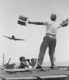 Keywords: LSO guiding SNJ aboard USS Monterey (CVL-26) 1953.jpeg U S Navy Landing Signal Officer Lt John Switzer communicates with an North American SNJ-5C Texan during carrier qualifications aboard the training carrier USS Monterey CVL-26 in 1953 http //collections naval aviation museum/emuwebdoncoms/pages/doncoms/Query php U S Navy National Museum of Naval Aviation photo No http //collections naval aviation museum/emuwebdoncoms/pages/doncoms/Display php irn 18804 QueryPage 2Femuwebdoncoms 2Fpages 2Fdoncoms 2FAdvQuery php 1996 488 014 032 1953-06-16 U S Navy PD-USGov-Military-Navy North American SNJ USS Monterey CVL-26 Landing Signal Officer |