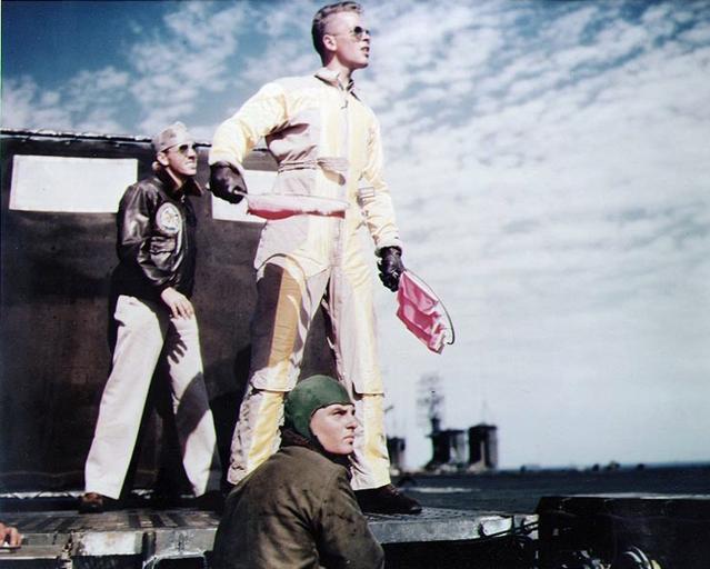 | Keywords: LSO on USS Belleau Wood (CVL-24) c1945.jpg A U S Navy Landing Signal Officer Lieutenant Junior Grade Walter F Wujcik bringing in a plane aboard the light aircraft carrier USS Belleau Wood CVL-24 circa 1945 Official U S Navy photograph http //www history navy mil/photos/images/k05000/k05186c htm 80-G-K-5186 ca 1945 USN PD-USGov-Military-Navy Landing Signal Officer USS Belleau Wood CVL-24 World War II color photographs of the Pacific War | ||||