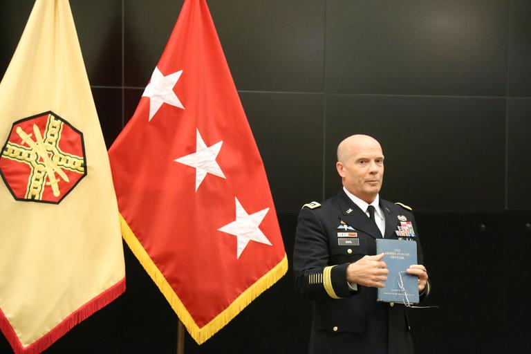 | Keywords: Lt. Gen. Kenneth R. Dahl, commanding general for U.S. Army Installation Management Command, greets Maj. Mark A. Fisher and his family at IMCOM headquarters Sept. 30, 2016, in advance of his promotion ceremony to lieutenant colonel. Family, coworkers and friends gathered at the operations center to hear the call to orders and join together in a receiving line and reception afterward. Dahl read an excerpt from a vintage copy of "The Armed Forces Officer" to inspire Fisher and the audience. (U.S. Army photo by Robert Dozier) |