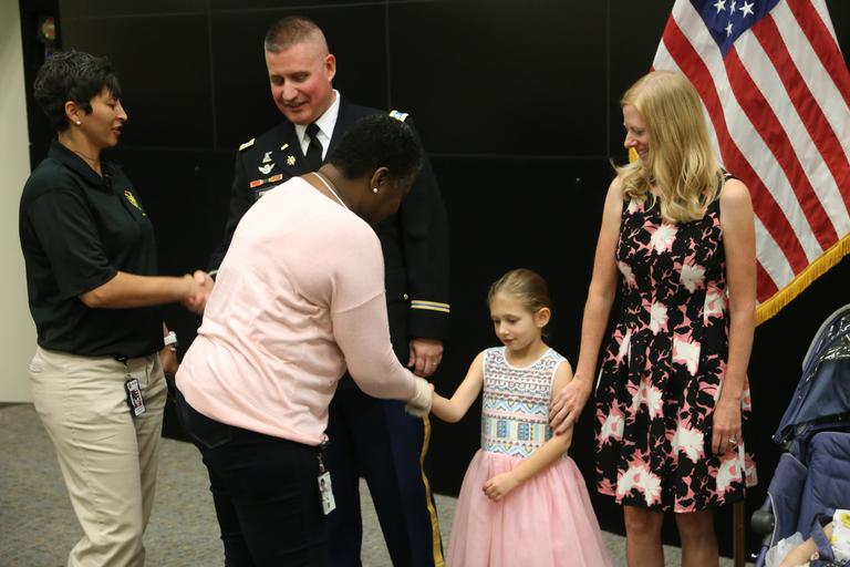 | Keywords: Lt. Gen. Kenneth R. Dahl, commanding general for U.S. Army Installation Management Command, greets Maj. Mark A. Fisher and his family at IMCOM headquarters Sept. 30, 2016, in advance of his promotion ceremony to lieutenant colonel. Family, coworkers and friends gathered at the operations center to hear the call to orders and join together in a receiving line and reception afterward. Dahl read an excerpt from a vintage copy of "The Armed Forces Officer" to inspire Fisher and the audience. (U.S. Army photo by Robert Dozier) |