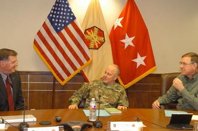 | Keywords: Lt. Gen. Kevin Mangum (center), Deputy Commanding General and Chief of Staff for U.S. Army Training and Doctrine Command, talks to Mr. Green (left) and Mr. Joseph Capps of U.S. Army Installation Management Command, April 19, 2016, at IMCOM Headquarters on Joint Base San Antonio, Texas. (U.S. Army photo by Geralyn Smith Noah) |