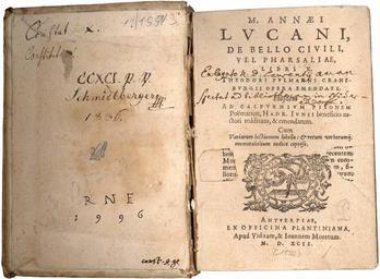 | Keywords: Lucanus, De bello civili ed. Pulmann (Plantin 1592), title page.jpg Lucan ™s De bello civili alias Pharsalia edited by Theodor Pulmann also Pulman or Poelmann printed by the Officina Plantiniana Plantin and Johannes/Jan Moretus in Antwerp in 1592 On the title page you see the Plantin printer ™s emblema On the title page and on the endpaper at the left side different old and new owner notes ” Lucan ™s poem was always especially popular in times of civil wars or other kinds of general conflicts This little edition is a good example because it was prepared and published during the French Wars of Religion 1562 “98 as Theodor Pulmann mentions in his preface He explains the special actuality of Lucan by this fact Lucans Epos De bello civili auch Pharsalia herausgegeben von Theodor Pulmann auch Pulman oder Poelmann gedruckt von der Officina Plantiniana Plantin und Johannes/Jan Moretus in Antwerpen 1592 Auf der Titelseite ist die Plantin-Druckermarke zu sehen Auf der Titelseite und auf dem Vorsatz links verschiedene alte Besitzeinträge ” Lucans Epos war immer in Zeiten des BĂĽrgerkrieges oder anderer genereller Konflikte besonders populär Diese kleine Ausgabe ist ein gutes Beispiel dafĂĽr weil sie während der französischen Hugenottenkriege 1562 “1598 erschien wie Theodor Pulmann in seinem Vorwort erwähnt Er begrĂĽndet damit die besondere Aktualität gerade dieses Dichters own Book printed by the Officina Plantiniana Plantin/Moretus Antwerp Scan by Aristeas 1592 book printed ; 2010-01-03 scanned <gallery> File Plantin emblema from title page of Lucanus De bello civili ed Pulmann 1592 jpg Detail the printer ™s emblema File Lucanus _De_bello_civili_ed _Pulmann_ Plantin_1592 _p _002-003 jpg Page 2-3 Pulmann ™s foreword beginning File Lucanus _De_bello_civili_ed _Pulmann_ Plantin_1592 _p _004-005 jpg Page 4-5 Pulmann ™s foreword end </gallery> PD-old 1592 books Title pages from Belgium Pharsalia Jan Moretus Title pages in Latin |