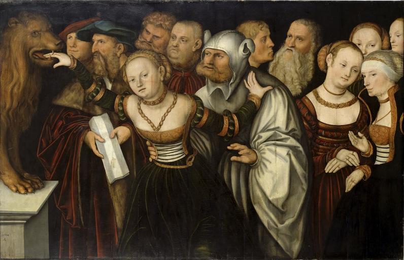 Keywords: Lucas Cranach d.Ä. - Bocca della Verità (Germanisches Nationalmuseum).jpg Workshop of possibly langSwitch Die Fabel vom Mund der Wahrheit Das Gemälde zeigt eine seit dem Spätmittelalter häufig thematisierte Weiberlist Eine des Ehebruchs angeklagte Frau legt die Hand in den Löwenrachen Sie bekennt nur in den Armen ihres Ehemanns und des Narren gelegen zu haben Da sie die Wahrheit spricht beißt der Löwe nicht zu Der Narr ist in Wirklichkeit ihr verkleideter Liebhaber Von den Zeugen wird er jedoch nicht ernst genommen Die Szene spielt auf die römische Steinmaske bocca della veritá an die der Legende nach jedem Lügner die Hand abbeißt The Fable of the Mouth of Truth Painting on beechwood The painting depicts the frequently employed late medieval theme of the Wiles of Women A woman charged with infidelity lays her hand in the jaws of the lion She confesses only to have lain in the arms of her husband and the fool behind her Because she is speaking the truth the lion does not bite off her hand The fool is in fact her disguised lover but he is not taken seriously by any of the witnesses The scene alludes to the Roman stone mask bocca della veritá which according to legend bites off the hand of every liar 1534 painting beech cm 75 5 117 4 Institution Germanisches Nationalmuseum accession number Gm1108 http //www lucascranach org/digitalarchive php Cranach Digital Archive search FR278 object history credit line exhibition history langSwitch Artist's insignia bottom left winged serpent with elevated wings facing right and dated '1534' Bezeichnet links unten nach rechts ausgerichtetes Schlangensignet mit stehenden Flügeln und 1534 datiert Friedländer Rosenberg 1978 No FR278 http //objektkatalog gnm de/objekt/Gm1108 Germanisches Nationalmuseum PD-old-100-1923 DEFAULTSORT Cranach Lucas 1; Bocca della Verita 1534; Germanisches Nationalmuseum Mythological paintings by Lucas Cranach I Hans Cranach Paintings by Lucas Cranach I in the Germanisches Nationalmuseum Workshop of Lucas Cranach I 1534 paintings 1530s paintings from Germany People with lions in art 1530s paintings in Bavaria Panel paintings Scanned with Heidelberg Tango |