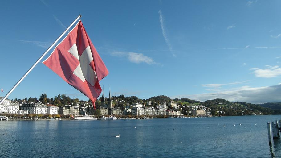 Keywords: lucerne lake lucerne region swiss flag flag hofkirche sky water blue switzerland
