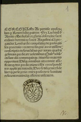 | Keywords: Luchino - De prologis seu proemiis materna lingua conscriptis, anni Iubilei 1500 die 12 novembris - 2404197.jpg Book Luchino d'Arezzo De prologis seu proemiis materna lingua conscriptis industria et impensa Alexandri Minutiani oratoris facundissimi Impressum Mediolani ita it De prologis seu proemiis materna lingua conscriptis - Impressum Mediolani industria et impensa Alexandri Minutiani oratoris facundissimi anni Iubilei 1500 die 12 novembris - 124 c ; a-p q ; 8º - Testo in italiano titoli in latino BEIC 2404197 Institution BEIC PD-old-100-1923 Predicazione - Manuali - Sec 15 Teologia pastorale Religious texts Incunabula in lingua italiana |