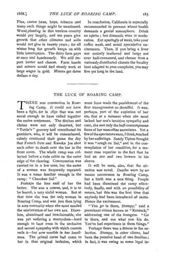 | Keywords: Luck of Roaring Camp.jpg en First page of the short story The Luck of Roaring Camp by American writer F Bret Harte From the Overland Monthly August 1868 Scanned by http //quod lib umich edu/m/moajrnl/ahj1472 1-01 002/1 16 view toc;q1 luck+of+roaring+camp Making of America project 1868-08 From http //quod lib umich edu/m/moajrnl/ahj1472 1-01 002/1 16 view toc;q1 luck+of+roaring+camp Making of America University of Michigan Bret Harte author other versions PD-old-70-1923 Overland Monthly Bret Harte 1868 in California Uploaded with UploadWizard |