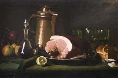 Keywords: Ludwig Glötzle Brotzeit-Stilleben mit Schinken.jpg Brotzeit-Stilleben mit Schinken Zitrone Brot Äpfeln Trauben Karaffe Römer und Kupferkanne Öl auf Leinwand signiert 53 5 x 81 cm http //www auktion-bergmann de/ Auktionshaus Bergmann by 1929 Creator Ludwig Glötzle PD-old-70 Images from Auktionshaus Bergmann Ludwig Glötzle Still life paintings of meats