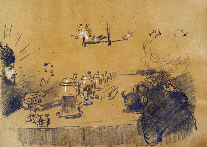 Keywords: Ludwig Scheuermann (1859 in Burghersdorp - 1911 in Herrsching) - Die Wirkung des Zitterspiels.jpg de Die Wirkung des Zitterspiels originale Bleistiftzeichnung auf braunem Papier ca 25x34cm; München 1888 Blatt papierbedingt leicht wellig von Ludwig Scheuermann 1859 in Burghersdorp/Südafrika - 1911 in Herrsching Blatt aus dem Album/Gästebuch aus den Jahren 1886 - 1898 der Münchner Mittwochsgesellschaft die der Verleger Hugo Bruckmann 1863 - 1941 im Zentral-Café Ungerer Dachauer Str 9 gegründet hatte Unter den Mitgliedern waren neben Scheuermann und Bruckmann der Verleger Edgar Hanfstaengl 1842-1910 die Maler August Leonhardi 1867 - 1931 Anton Mangold 1863 - 1907 und Moritz Röbbecke 1857 - 1916 Winfried von Miller 1854 - 1925 und Otto Seitz 1846 - 1912 1886 - 1898 http //www zvab com/servlet/BookDetailsPL bi 16238060996 searchurl kn 3Daugust 2520otto 2520krug 26hl 3Don 26sortby 3D20 Ludwig Scheuermann 1859 in Burghersdorp/Südafrika - 1911 in Herrsching other versions PD-Art Ludwig Scheuermann |