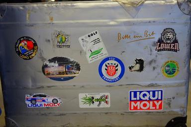 Keywords: luggage metal case used sticker glued well traveled travel suitcase