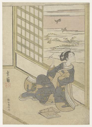 | Keywords: Luisterend naar de watersnip-Rijksmuseum RP-P-1964-800.jpeg accession number RP-P-1964-800 Suzuki Harunobu; Suzuki Harunobu died 1770; Sogiku credit line nl Meisje met haarpen in haar rechter hand zit tegen een vensterbank en kijkt naar buiten naar een landschap met water en vogels; naast haar op de vloer twee boeken Waarschijnlijk deel van een twee- of drieluik Label Line mentioned on object Suzuki Harunobu 1725 - 1770 1765 kleurenhoutsnede; lijnblok in zwart met kleurblokken; blinddruk Collection prenten; Japan collectie blad Height mm 272 blad Width mm 194 exhibition history Institution Rijksmuseum paper object history Acquisition 1964 object type prent PD-US PD-old-100 Data and photography rights All data and all images made available through the API are either in the public domain or are subject to a CC0 license https //www rijksmuseum nl/en/api/terms-and-conditions-of-use cc-zero place of creation Japan Jap Cat I 31; Forrer 1 http //www rijksmuseum nl/collectie/RP-P-1964-800 http //hdl handle net/10934/RM0001 COLLECT 45340 handle Luisterend naar de watersnip Uploaded with GWToolset Rijksmuseum RP-P-1964-800 http //www rijksmuseum nl/media/assets/RP-P-1964-800 Images uploaded by Fæ Images from the Rijksmuseum Japanese 18th-century prints in the Rijksmuseum Amsterdam |