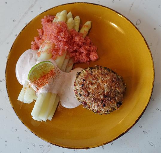 Keywords: lumpfish roe lemon roe cutlet white asparagus asparagus giblets dressing food dining served first course